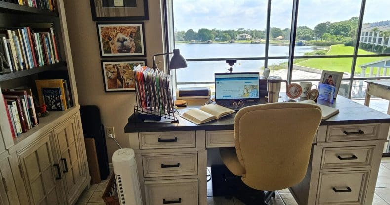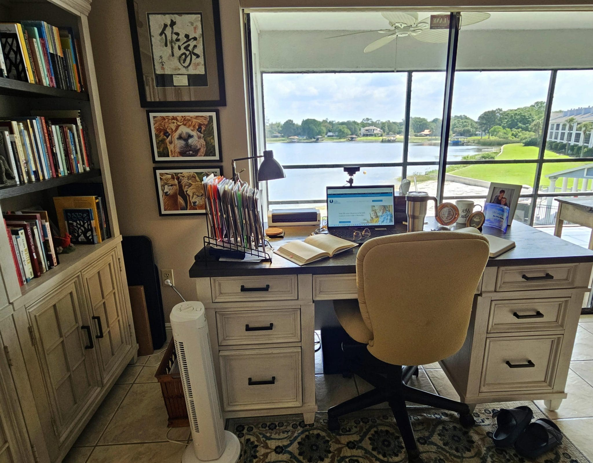My writing desk is in the living room and faces Lake Fairview. I love this bright space because I feel like I’m outside even when I’m not.