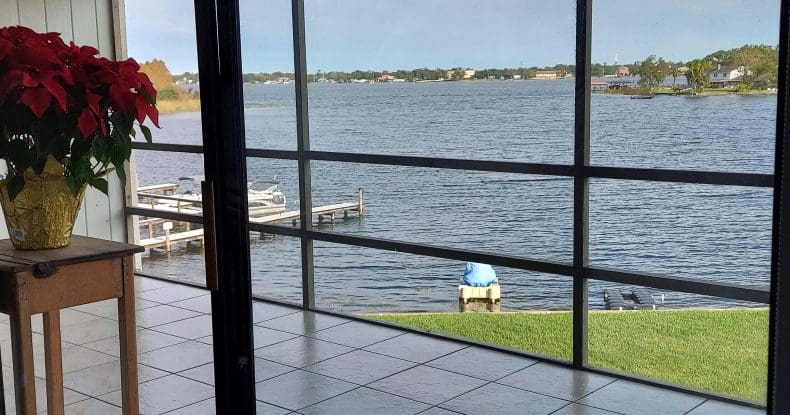 My husband Bob and I are fortunate to live in a third-floor condo on one of Florida’s 7,500 lakes, and our living room and master bedroom’s sliding glass doors open onto a screened-in porch that look out over Lake Fairview. I purposely have no patio furniture on the porch because I don’t want anything to interfere with my view.